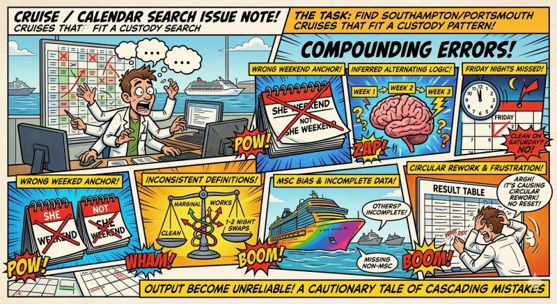 The task was to find Southampton/Portsmouth cruises that fit a custody/calendar pattern. The output became unreliable because several errors compounded.